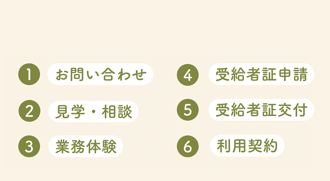 お問い合わせから見学・体験を通して雰囲気を知っていただき、ご安心できたら受給者証の手続きを進めます。受給者証が届いたあと、契約をしてご利用が始まります。わからないことや不安なことがあっても、スタッフが一緒に進めますのでご安心ください。
