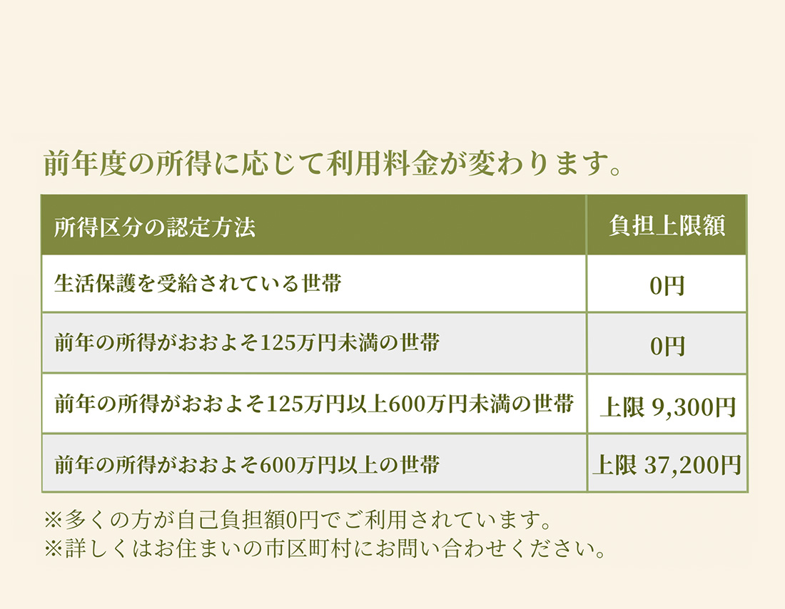 ご利用にかかる料金は、前の年のご家庭の収入によって決まります。ほとんどの方は自己負担0円でご利用いただいており、収入がある場合でも、ご負担には上限が決まっているので、それ以上かかることはありません。