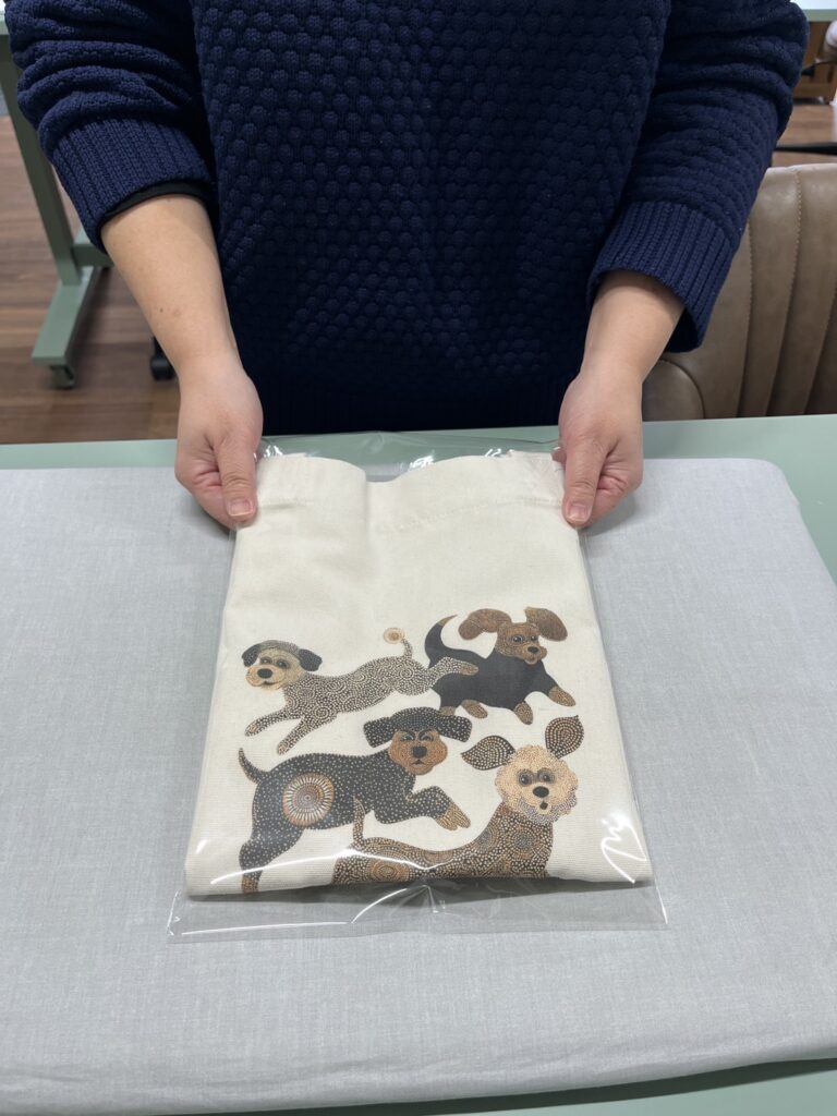 写真のトートバッグに描かれている犬のデザインは、この度の体験者様がこの数日でデザインしたものです。