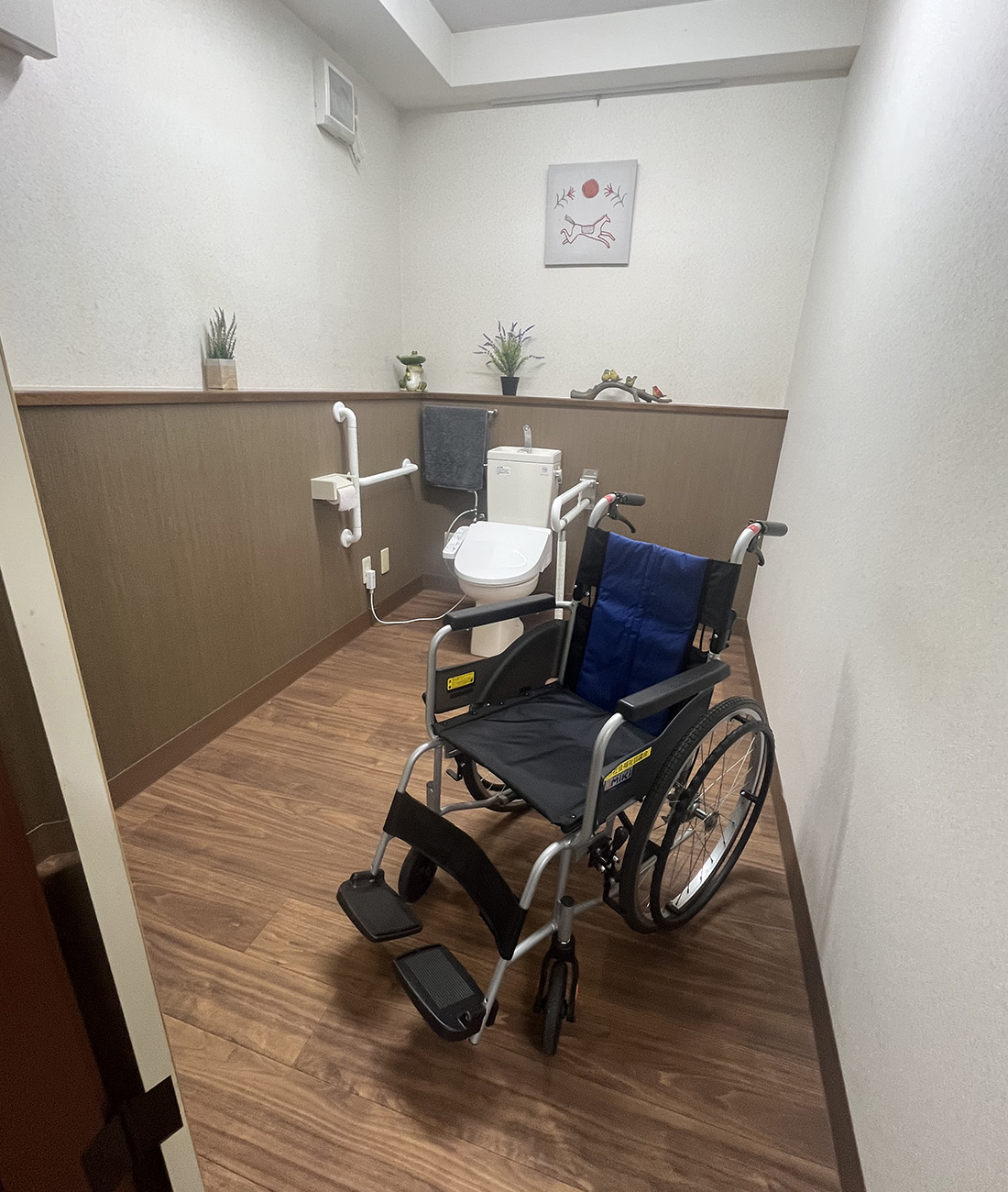さらに、車椅子の方や介助が必要な方も安心して利用できる多目的トイレを設置。広々としたスペースに手すりを配置し、木のぬくもりと植物のやさしさが感じられる空間で、設備の便利さだけでなく、“人にやさしい思いやり”をかたちにしています。すべての方が安心して過ごせるよう、清潔で快適なトイレ環境を2つ整えています。もちろん2つともウォシュレット機能付きです。