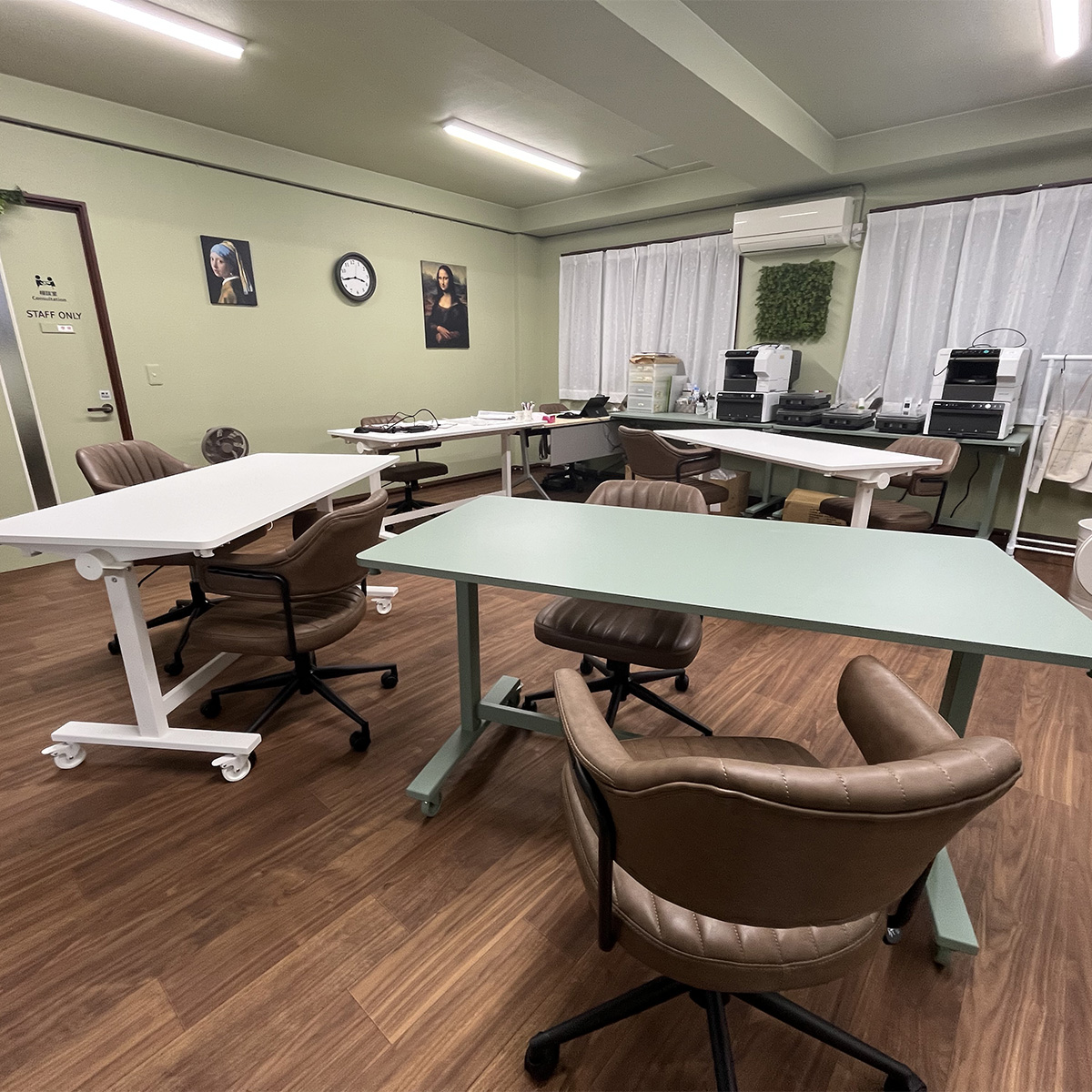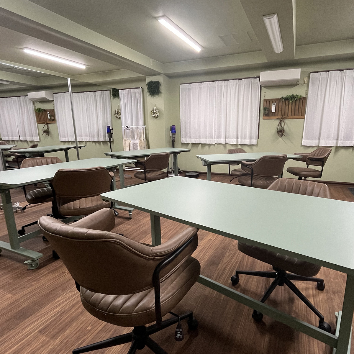 ひとりひとりのペースを大切にしながら、少しずつ自信を育てていく。ここは、そんな想いが息づくB型就労スペースです。やわらかなグリーンの壁と木のぬくもりが心を落ち着かせ、ゆったりと配置されたテーブルが、安心して作業に取り組める環境をつくります。一日の作業を心地よく過ごせるよう、空間のすみずみに思いやりを込めました。