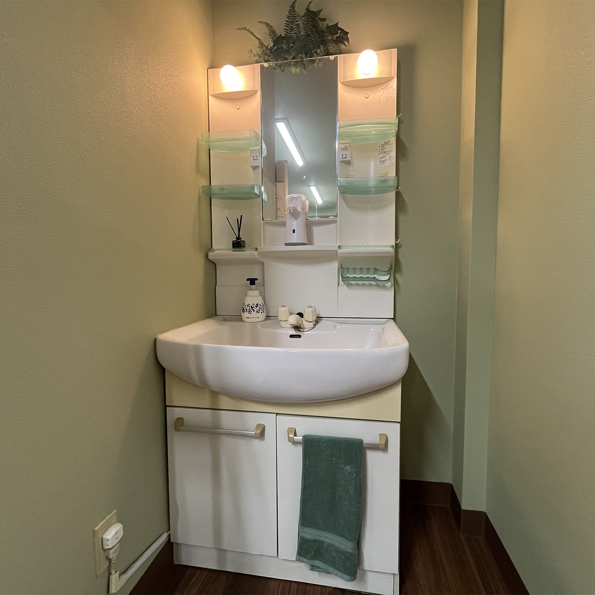 日々の中で何気なく使う場所だからこそ、清潔さと心地よさにこだわりました。淡いグリーンの壁と温かい照明に包まれた洗面スペースは、利用者の方が安心して身支度を整えられる、やさしい空間です。